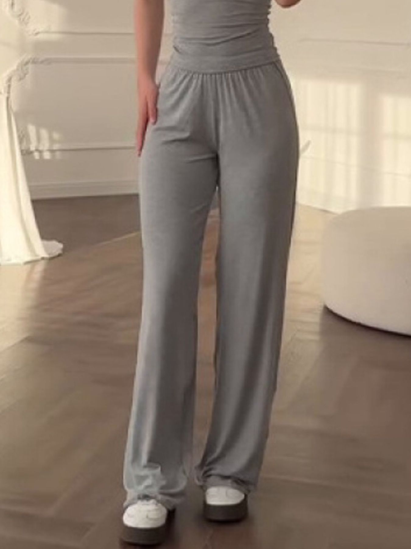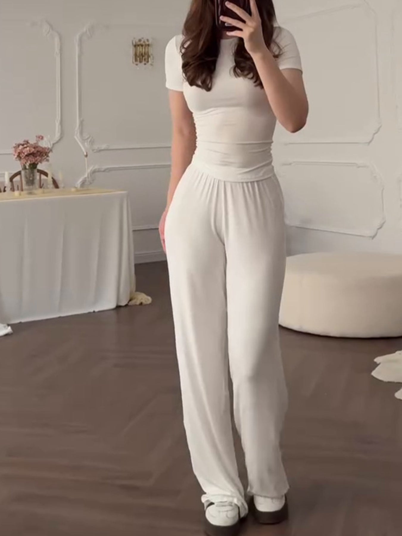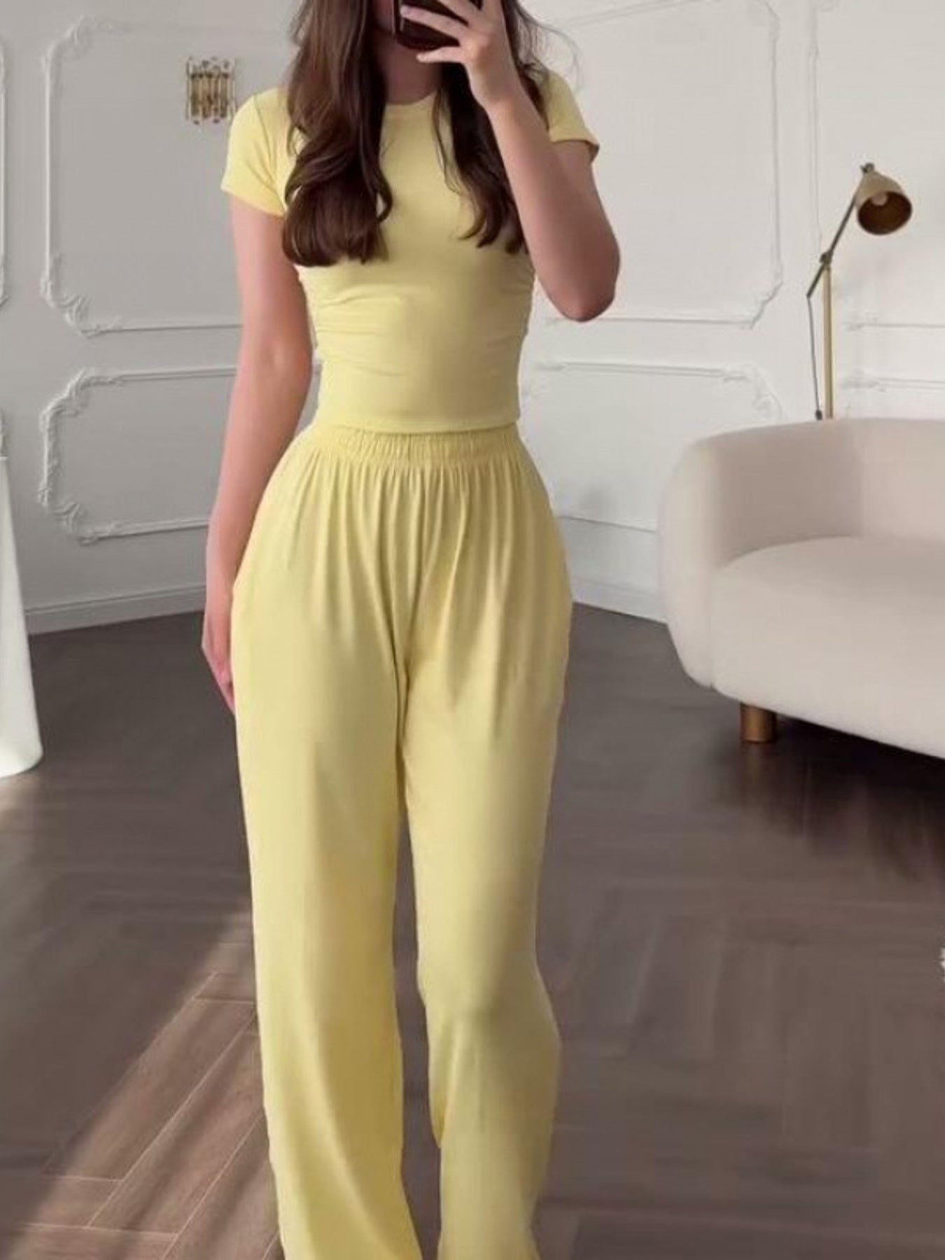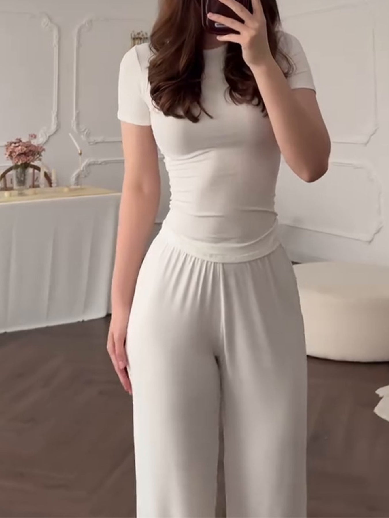 Full Size Round Neck Top and Wide Leg Pants Set Plus Size